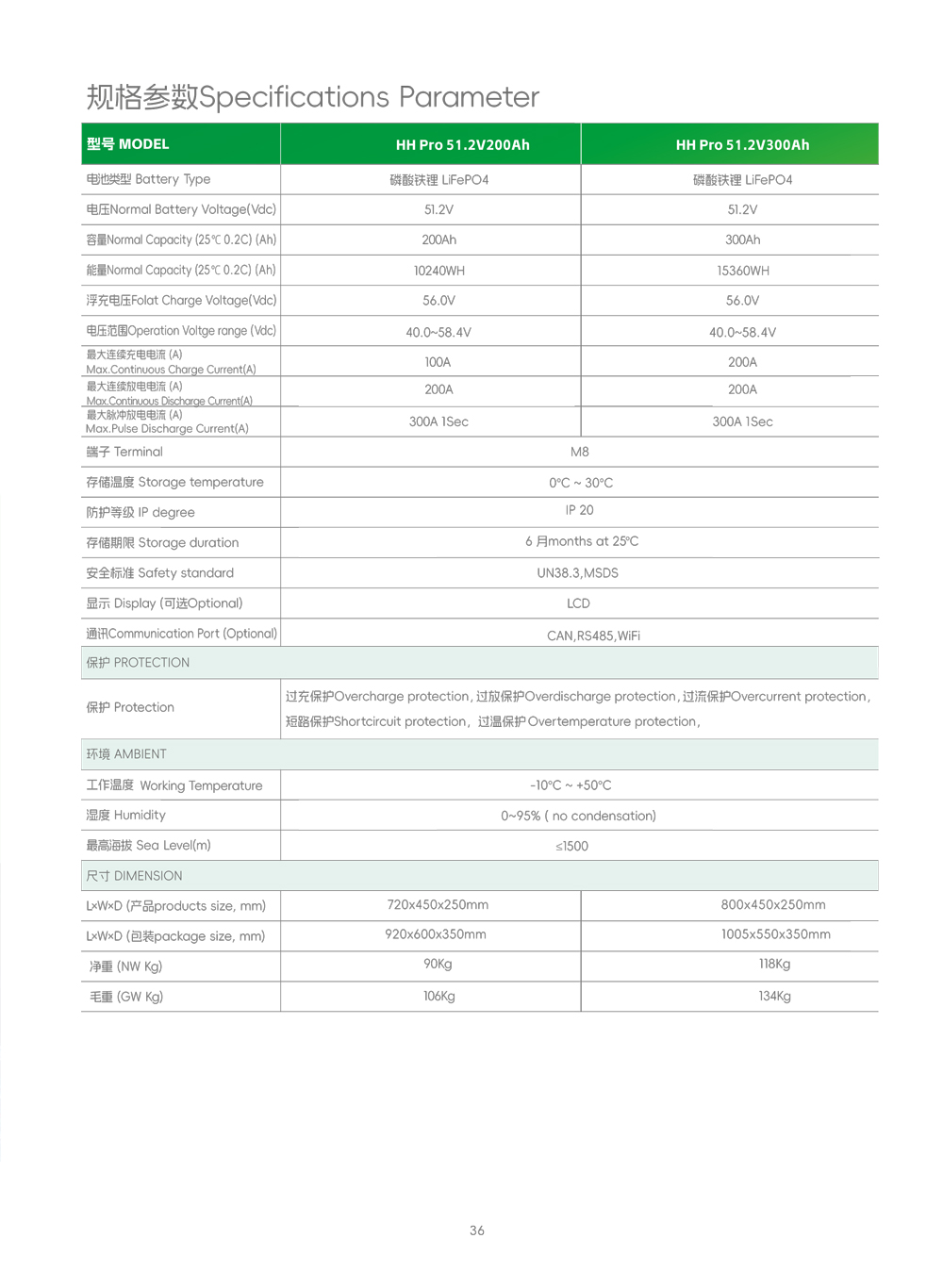 Big charge/discharge current up to 200A/200A, suitable for solar storage system.