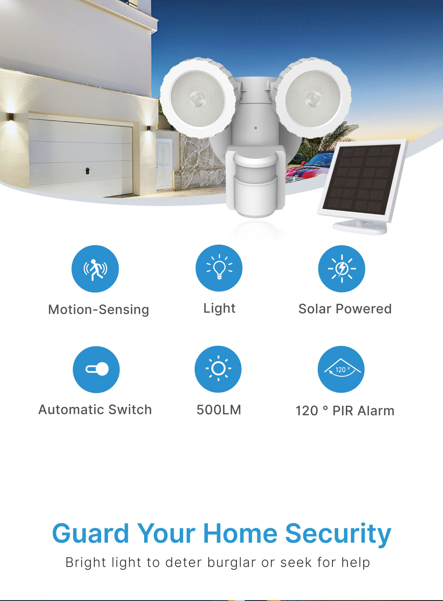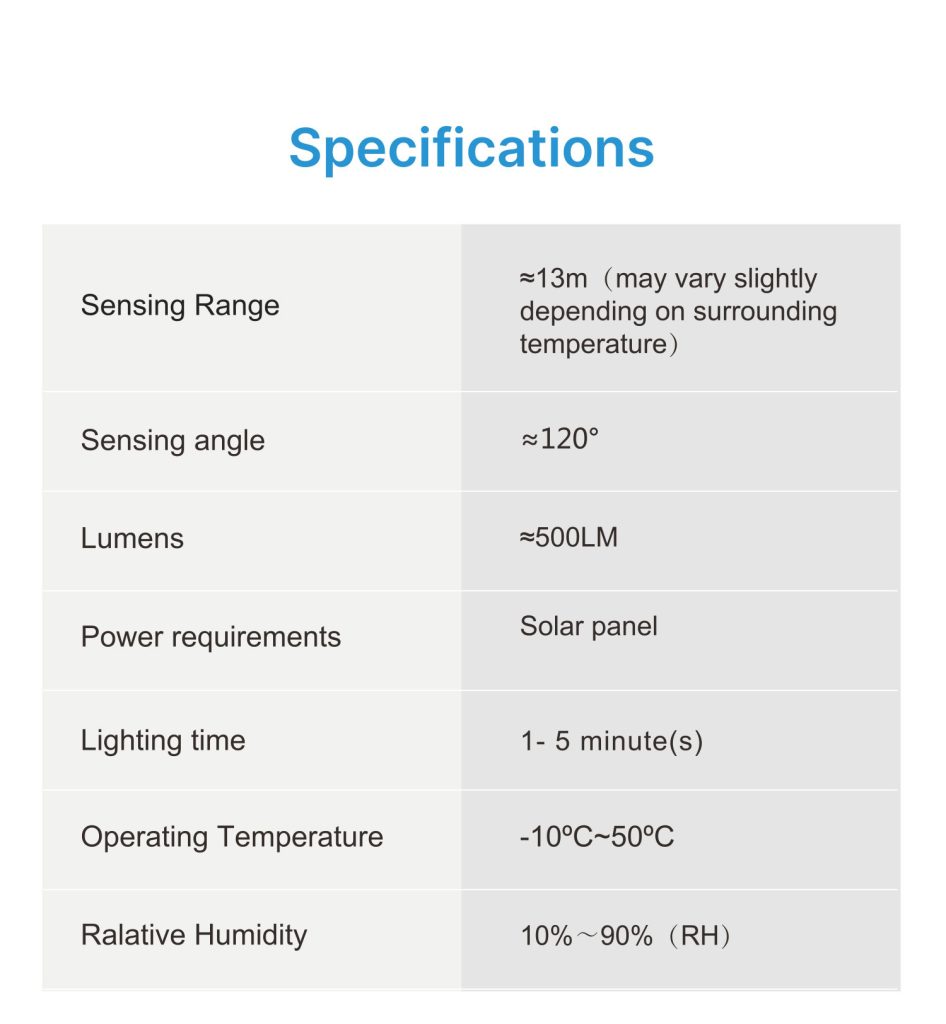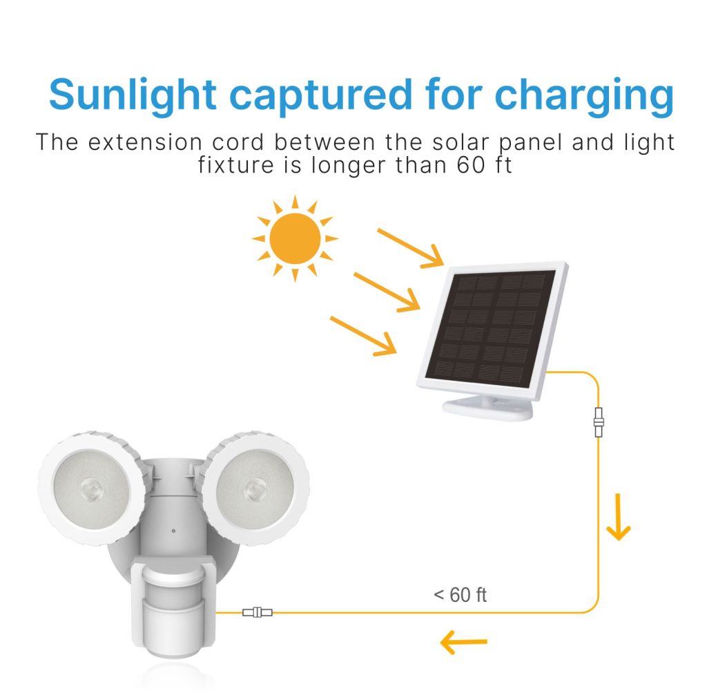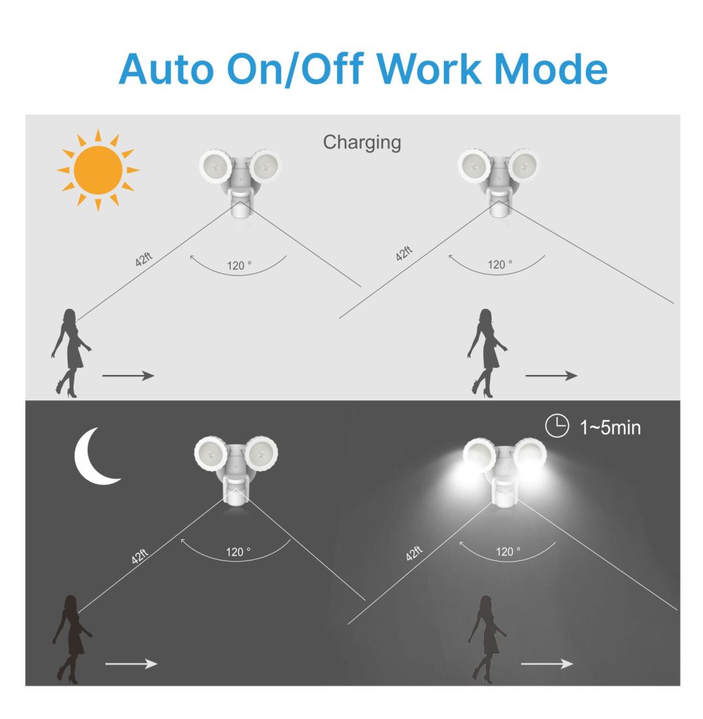 This solar security light is a dual head LED motion activated light. No wiring is needed for installation and the light is ideal for remote areas or places without power. It runs entirely on solar energy, which will help you save on your electricity bill. It provides sufficient illumination up to 500 Lumens and helps with home security to deter potential threats. Solar power allows you to locate the light anywhere you like and anyone can DIY complete installation in minutes.